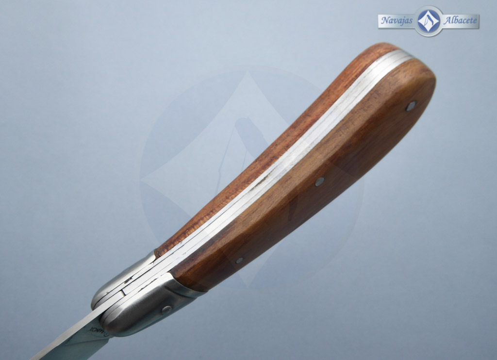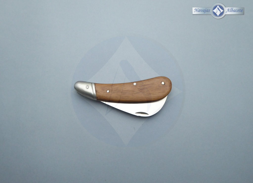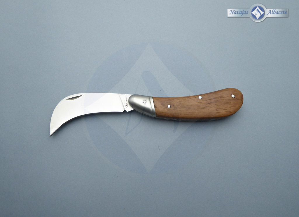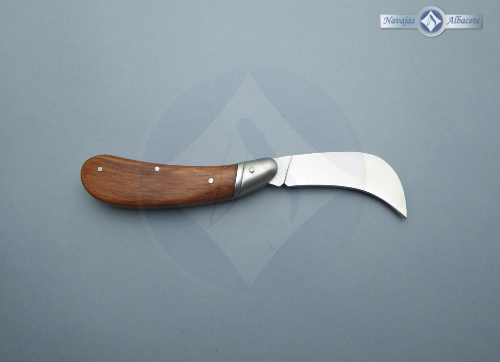 Descripción: Navaja Tranchete con mango de madera y virola de acero. Hoja de acero inoxidable molibdeno vanadio, con uña. Cierre de pistón. Especial para vendimiar, recoger setas, espárragos, etc.