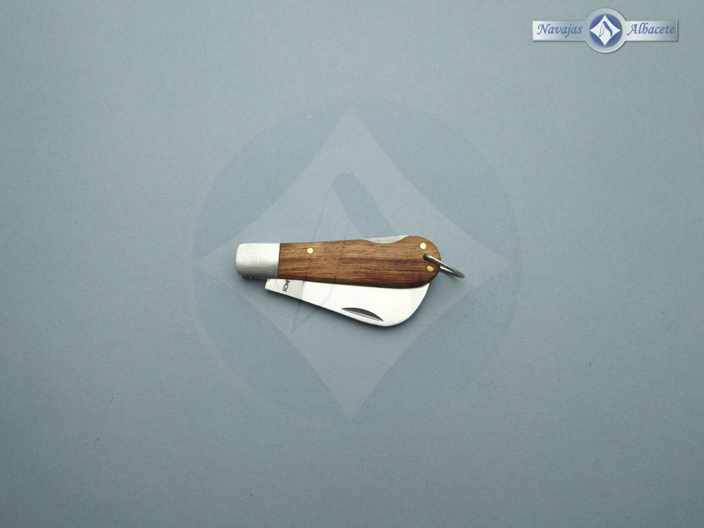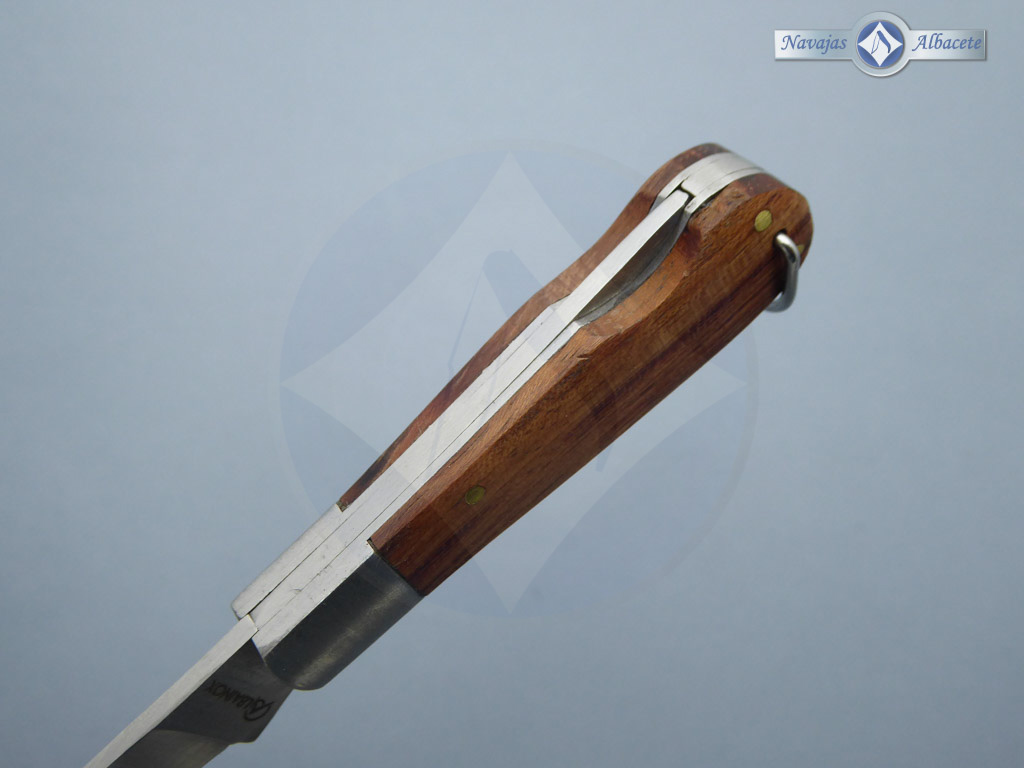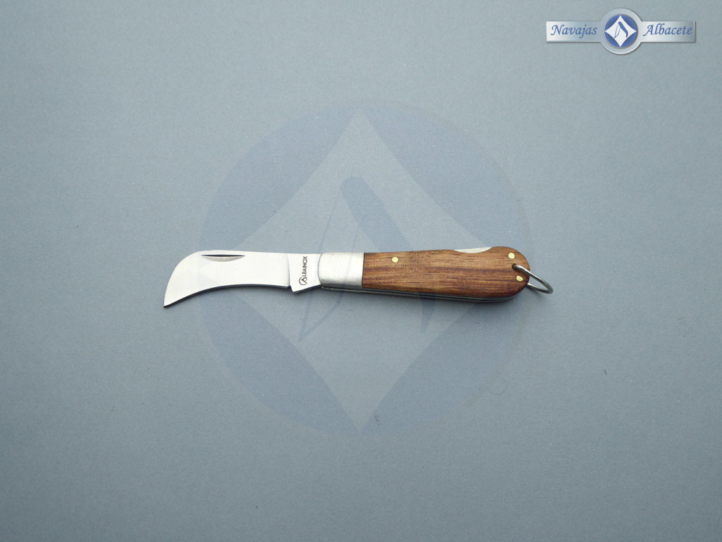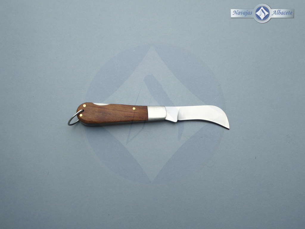 Descripción: Navaja tranchete, tamaño bolsillo, con mango de madera y virola de acero. Anilla plegable en el pomo. Hoja de acero inoxidable molibdeno vanadio, pico loro, con uña para su fácil extracción. Bloqueo de seguridad back lock. Diseñada en España. Especial para vendimiar, recoger setas, espárragos, etc. Pequeña herramienta para labores agrícolas y de recolección.