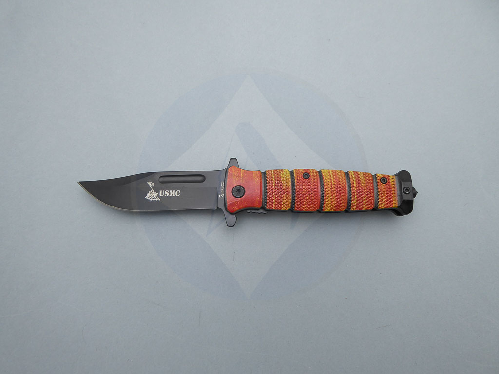 Descripción: Navaja táctica USMC con mango de ABS con diseño 3D. Hoja de acero inoxidable molibdeno vanadio acabado negro, con grabado USMC. Incluye punta rompe cristales y clip metálico trasero. Sistema de bloqueo Liner lock. Diseñada en España.