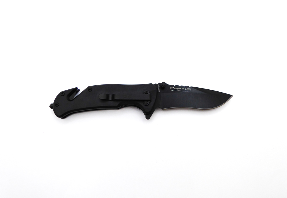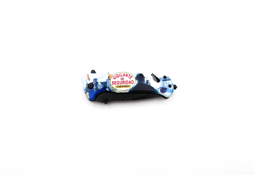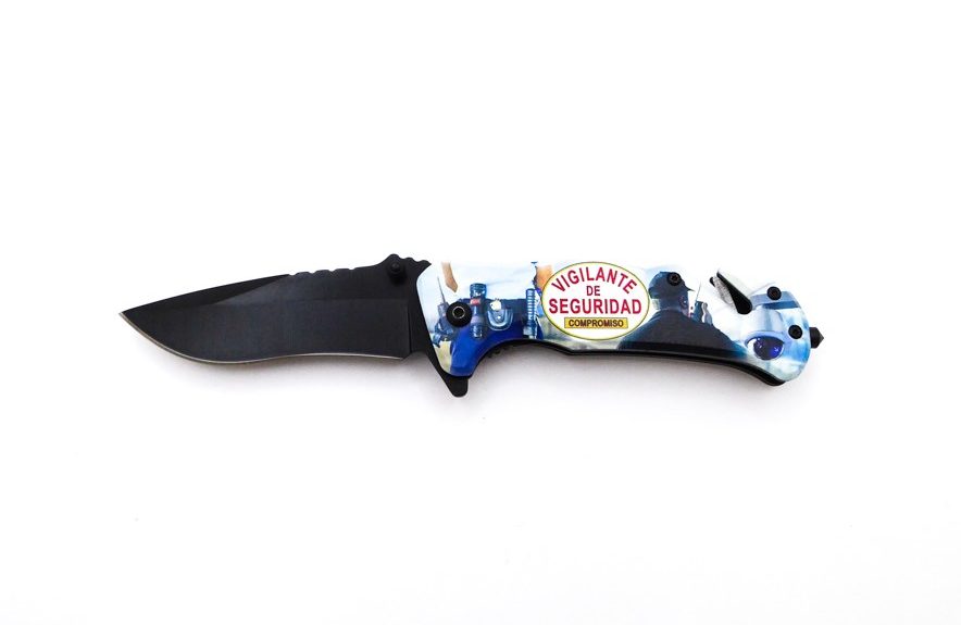 Descripción: Navaja táctica «Vigilante de seguridad» con mango en aluminio con impresión efecto 3D. Hoja en acero molibdeno vanadio color negro. Punta rompecristales, clip porta cinturón, bloqueo de seguridad linear lock y cúter corta cinturón de una cuchilla. Diseñada en España.