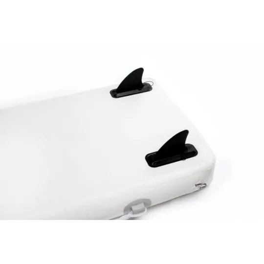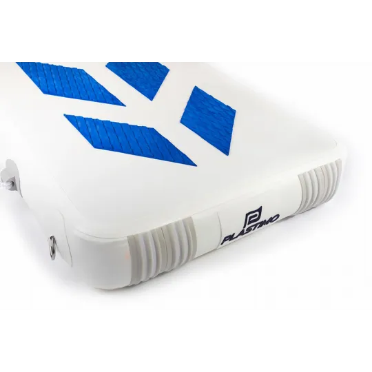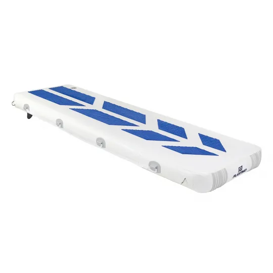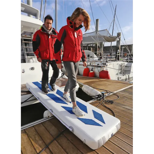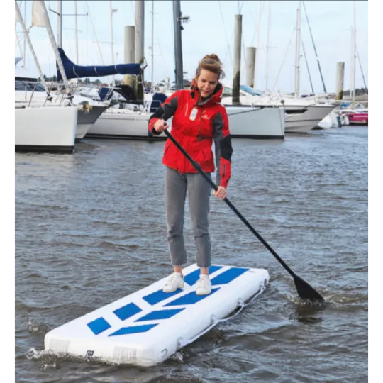 Más larga y ancha que la mayoría de pasarelas rígidas tradicionales, también es más versátil: se convierte en plataforma de baño o tabla de paddle si se le añaden aletas.