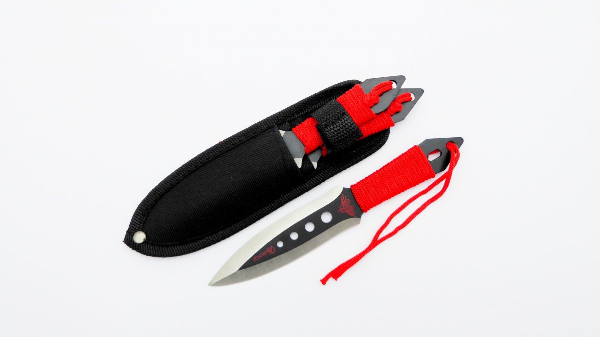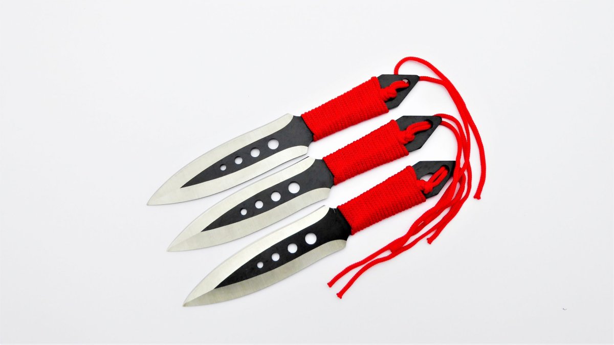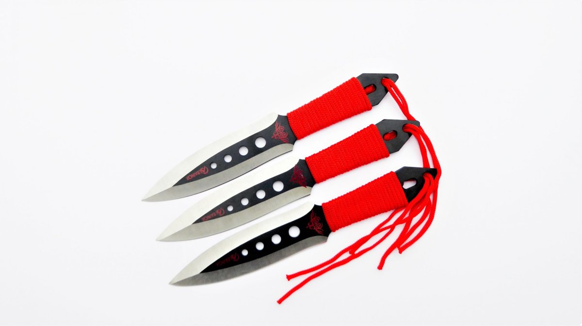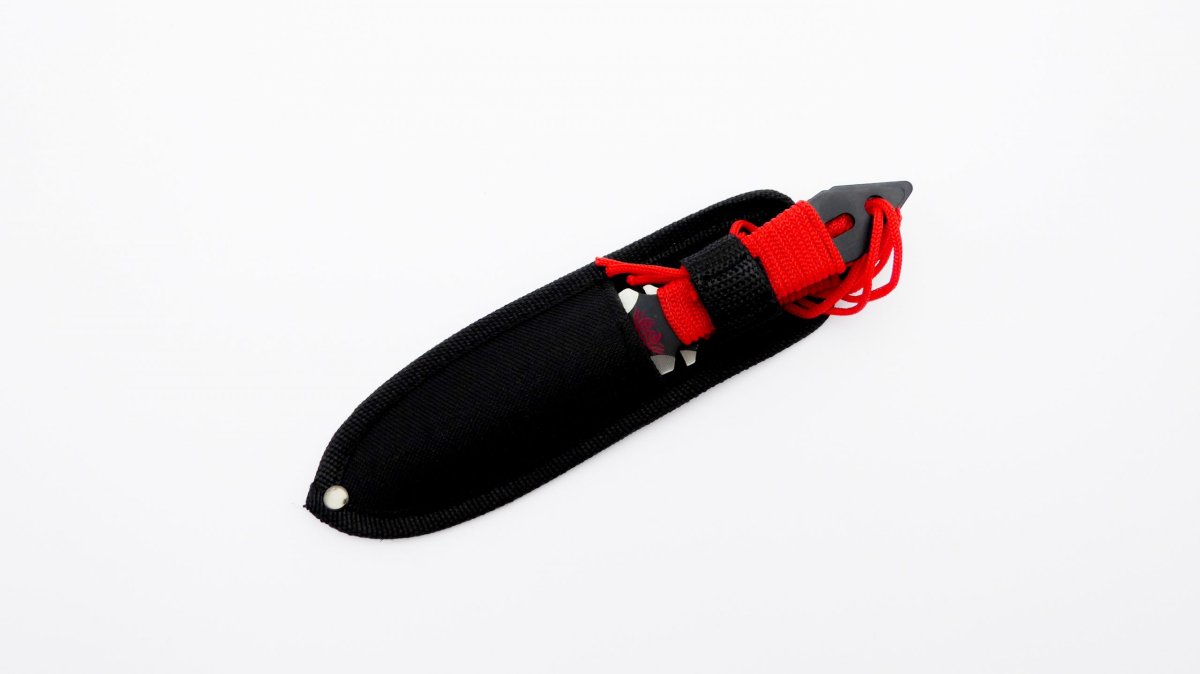 Descripción: Set de 3 cuchillos lanzadores con mango de acero acabado negro encordado rojo. Hoja de acero inoxidable molibdeno vanadio calada acabado negro. Hoja de un filo. Incluye funda en nailon con porta cinturón.